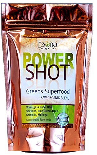 100 % PURE - Raw Organic Vegan - Power Shot Greens Superfood Blend - Spirulina, Chlorella, Wheat Grass, Blue-Green Algae, Kale, More! - 60 SERVINGS from Essona Organics, Powder - 180 gms. Order Now.. Power Shot is a synergistic "green" formula of Raw, Vegan, Organic concentrated, nutrient-dense alkaline superfoods. A valuable source of naturally occurring phytonutrients, chlorophyll, live enzymes and bioavailable vitamins and minerals, Power Shot aims to help boost energy and stamina, assist with mineral replenishment and provide optimal support for the body's systems. It is bio-available and easily absorbed. 60 FULL SERVINGS - 2 MONTH SUPPLY. MADE IN THE USA.