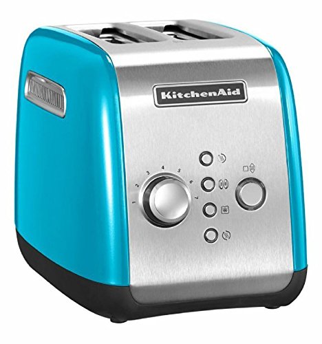 KitchenAid Artisan 2 Slot Toaster - Crystal Blue has the following specifications The KitchenAid 5KMT221 toaster 2 slice has motorised lower and lift function this is controlled by the toast/cancel button. Toast can be kept warm for upto 3 minutes using the keep warm feature. KitchenAid have combined striking design and the best technology available to create this 2 slot toaster. The 5KMT221 has been designed to match with the KitchenAid kettle, chopper, hand blender and the KitchenAid food processor. The KitchenAid 2 slice toaster features a host of functions including defrost, extra wide slots and 7 shade settings.