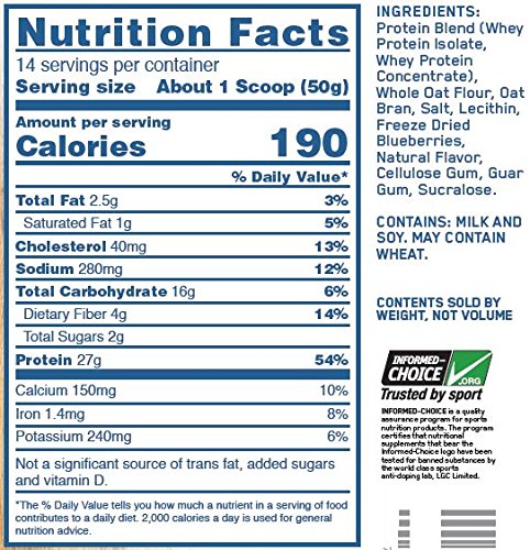 Optimum Nutrition On Whey & Oats Protein Powder with 14 Servings, Blueberry Muffin. WHEY-&-OATS from Optimum Nutrition, an easy-mixing shake designed to fuel your busy morning with delicious breakfast time flavors. WHEY-&-OATS combines whey - a complete protein with all the essential amino acids to help support muscle recovery, and oats -- a complex carbohydrate that provides energy to support strength and endurance. All you need to mix one up is a glass and spoon.