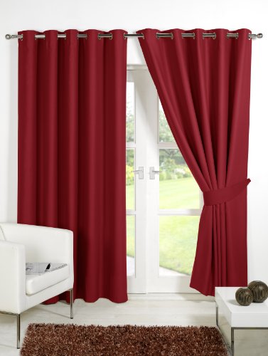 Pair of RED 90" Width x 90" Drop , Supersoft Thermal Blackout EYELET / RING TOP Curtains Including Pair of Matching Tie Backs, 'Winter Warm but Summer Cool' by VICEROY BEDDING has the following specifications Energy efficient for maximum insulation, keeps heat in / keeps light out. These curtains will transform your room with its blackout qualities and with its unique supersoft drape material of soft sheen. This is a Double Face curtain i.e. same colour on both sides and is perfect for any room. Easy to hang and Easycare.