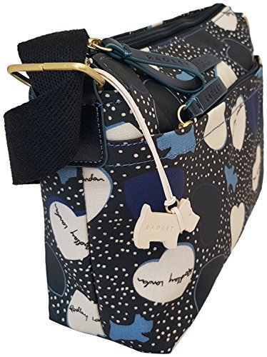 RADLEY Hearts Oilskin Black Medium Cross Body Bag - RRP £75.00 has the following specifications Radley Hearts Medium Cross Body Bag. The bag features secure zip top fastening and an adjustable cotton webbing shoulder cross body strap, and a detachable Radley embossed leather dog charm. There is a zipped pocket to the front, and the interior has a secure zipped pocket and twin mobile phone pouch, and Radley plaque motif. Dimensions: Height: 20 cm Width: 26 cm Depth: 8 cm. The oilskin bags do not come with a dust bag.