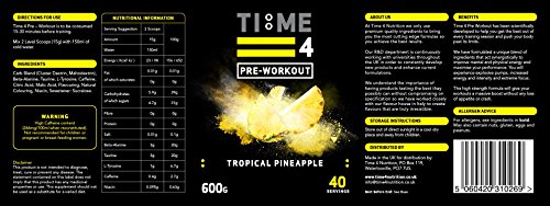 Time 4 Pre-Workout - Ultra High Strength Formula 40 Servings - Tropical Pineapple. Time 4 Pre-Workout has been scientifically developed to help you get the best out of every training session and push your body past its limits. We have formulated a unique blend of ingredients that act synergistically to improve mental and physical energy and maximise your performance. You will experience explosive pumps, increased energy and intensity, and extreme focus. This high strength formula will give your workouts a massive boost without any loss of appetite or crash.